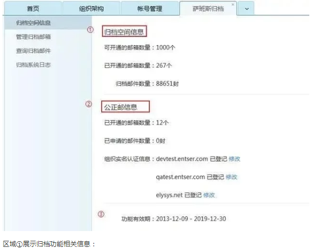 区域③展示归档功能和公正邮功能的有效期:a.功能有效期,若只开通归档功能,则只表示归档功能的有效期。若同时开通归档功能和公正邮功能,则表示归档功能和公正邮功能都可以正常使用的有效期;